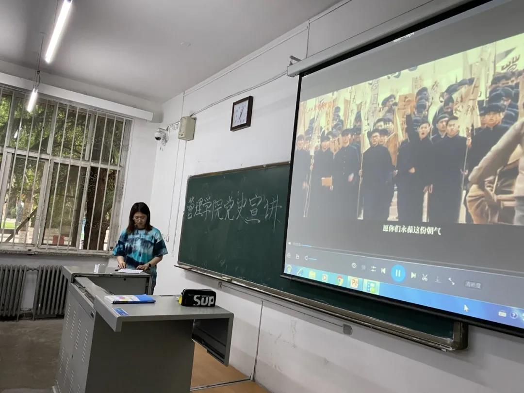 团委实践部部长李云宵带领同学们从建立中国共产党、没有共产党就没有新中国、没有共产党就没有社会主义中国、没有共产党就没有中国特色社会主义以及党的100年光辉历程给我们的深刻启示五方面进行了党史的学习,回顾了中国共产党团结带领中国人民实现中华民族伟大复兴走过的百年光辉历程。