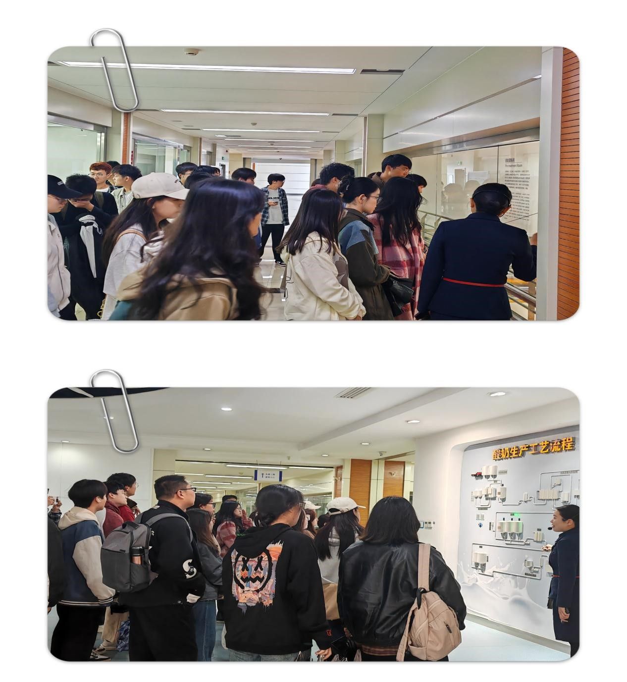同学们参观了君乐宝科学营养研发院、君乐宝牧场,注意到每一头奶牛都佩戴着高科技的智能项圈,惊讶于君乐宝在奶牛育种养殖上的精细化、科学化管理。君乐宝运输一体化模式、孔径小于0.001微米的膜过滤系统、INF蒸汽浸入式杀菌系统、无菌冷灌生产车间,让同学们深刻理解了现代生产工艺的自动化、智能化水平。