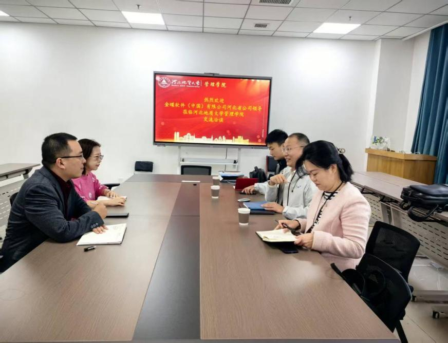 副院长胡海川、实验中心主任李芊、金蝶软件有限公司培训教育事业部总经理王雪、金蝶软件有限公司河北省公司总经理张永朝及李昂然共同出席会议,就产教融合、资源共享、人才培养等关键议题展开热烈探讨。