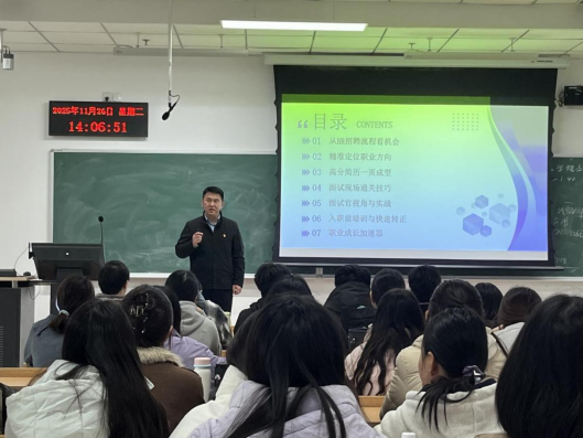 活动伊始,特邀嘉宾河北诺亚人力资源发展集团有限公司和美分公司张胜泽书记聚焦学生求职需求,分享了人力资源领域的实战干货。内容涵盖了从解析招聘流程、精准职业定位、简历优化技巧,到提升面试能力、理解招聘视角,乃至快速适应职场和规划长期发展的完整链条,为同学们提供了一整套从求职到入职的实用方法论,现场师生受益匪浅招聘流程透视机会把握深入解析企业招聘的全流程运作机制,从职位需求分析、招聘渠道选择到简历筛选标准,帮助学生理解招聘背后的商业逻辑,把握求职过程中的关键节点。