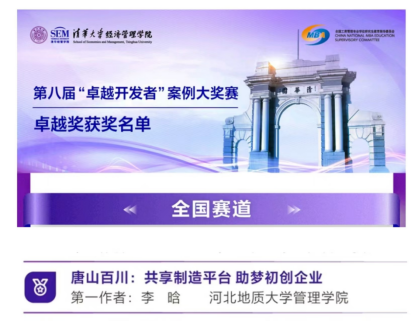 李晗老师团队撰写的案例《唐山百川:共享制造平台 助梦初创企业》在全国赛道中脱颖而出,荣获佳绩。