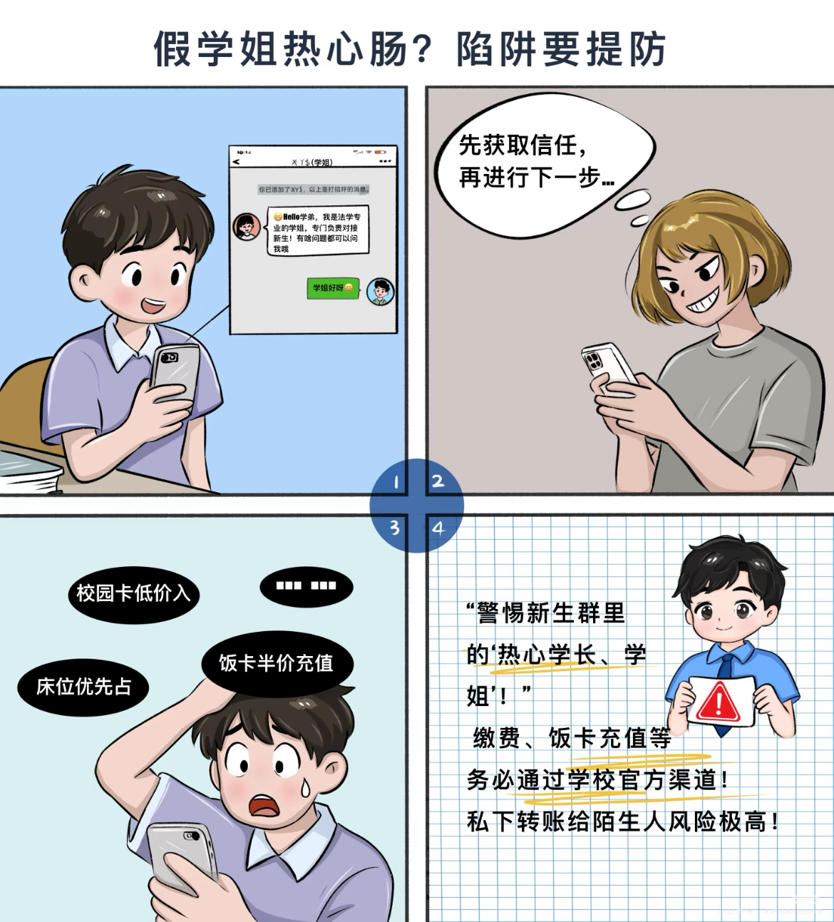 骗术:冒充学校或教育部门工作人员,以“发放助学金”“学费减免”为由,要求提供银行卡信息或转账“激活账户”。