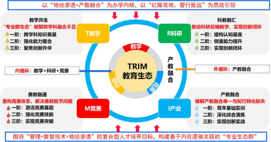 的学科发展整体布局,面向会 计学、旅游管理、工商管理等 9 个本科专业,以“地经渗透+产教融 合”为办学内核,以“红耀双地、管行致远”为思政引领,系统解 决管理类复合型人才培养中的关键问题。成果构建了以“TRIM”为 核心理念的教育生态(T-教学,R-科研,I-产业,M-竞赛),推动教学共生、科教融汇、产教融合与赛教融通四维深度融合,形成“内循环(教学+科研+竞赛)+外循环(产教融合)”双轮驱动机制,实 现“基础→融合→创新”三阶递进培养模式,实现学生知识、能力 与 素 养 的 阶 梯 式 跃 升 , 重 塑 管 理 类 人 才 培 养 新 范 式 。“TRIM”教育生态的有效运行,不仅依托于其所倡导的先进理念,更依赖于系统化专业结构的支撑。为落实 TRIM 理念,学院围绕“管理+数智技术+地经渗透”的复合型人才培养目标,构建了基 于内在逻辑关联的“专业生态群”,通过“共建课程平台、共享实 验资源、共担学科项目”的共享机制,实现从“单业作战”到“多业协同”的转变,实现理念向实践的有效转化。在运行机制上,依托“内循环+外循环”的双轮驱动模式,实现校内资源与产业需求 的有效对接,赋能人才培养的实战性与前瞻性。在培养路径上,实施“基础→融合→创新”三阶递进体系,逐步引导学生从知识积累走向能力整合与素养升华,实现知识、能力与素养的阶梯式跃升, 从而重塑具有地大特色的管理类人才培养新范式。